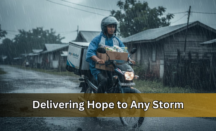 Leyte has a lot of rain and storms. Big delivery apps stop working when the weather is bad. Our "All-Weather" riders have the right gear to keep delivering food and hope to the 40 towns, no matter the weather.